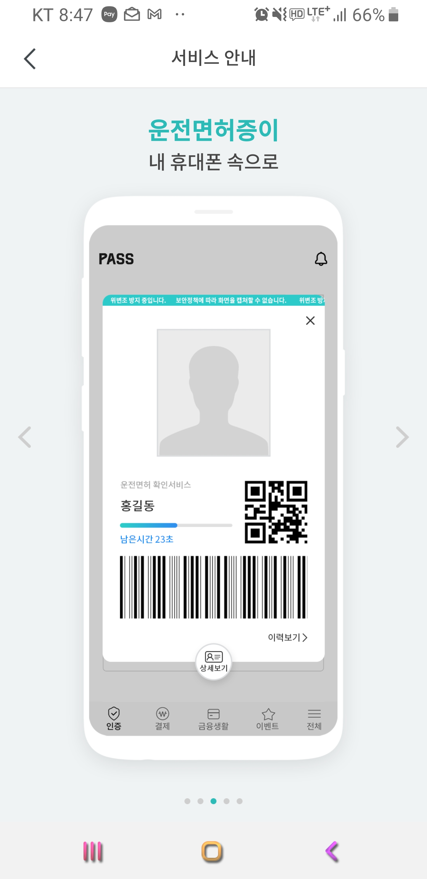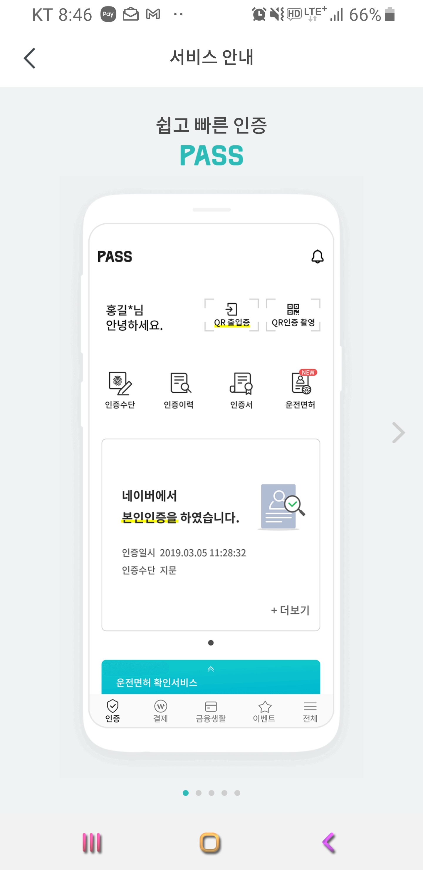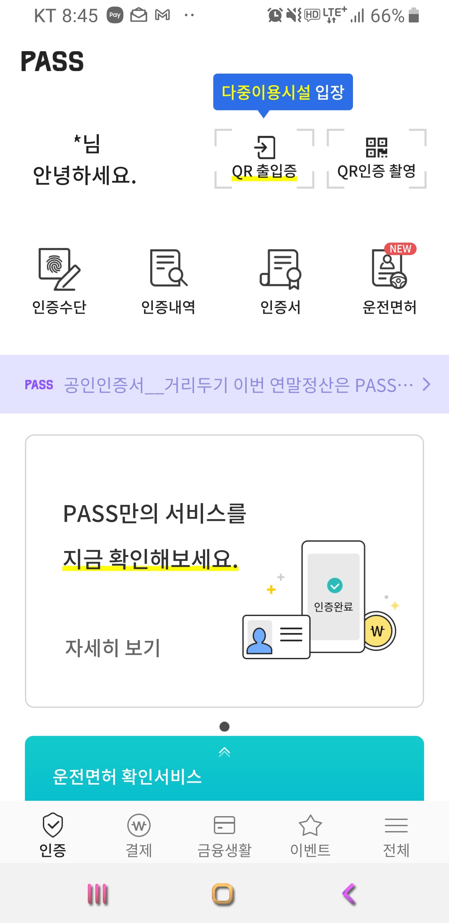 아래는 로그인 한 이후 화면입니다. QR 출입증, 인증수단, 인증내역, 인증서, 운전 면허 등이 등록되어 있습니다.